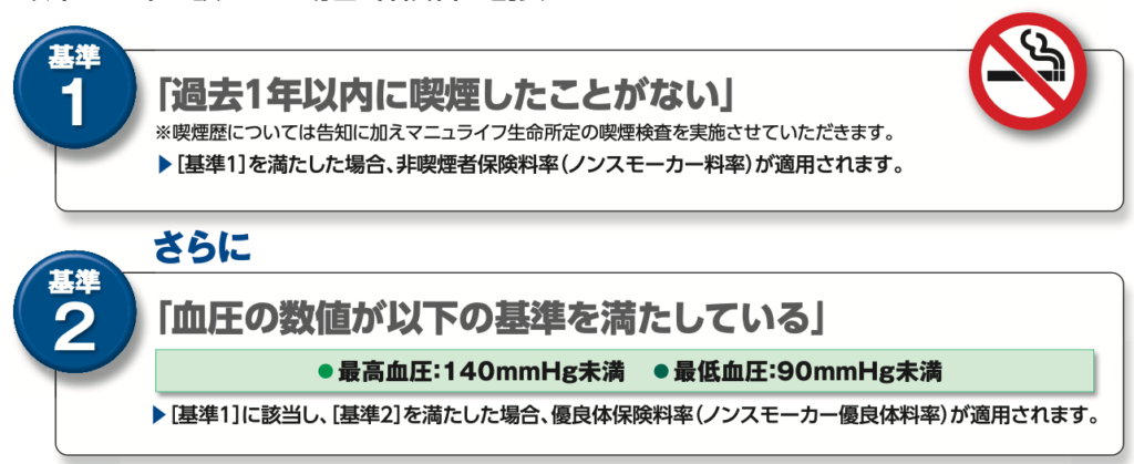保険料割引については、過去1年以内にタバコを吸っていない方は割引があり、さらに血圧の数値が基準(最高血圧:140mmHg 未満、最低血圧:90mmHg未満)を満たしていれば、もっと割引されます。