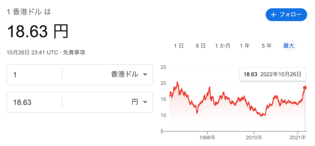 なお、現在は対香港ドルに対しても歴史的な円安となっております。