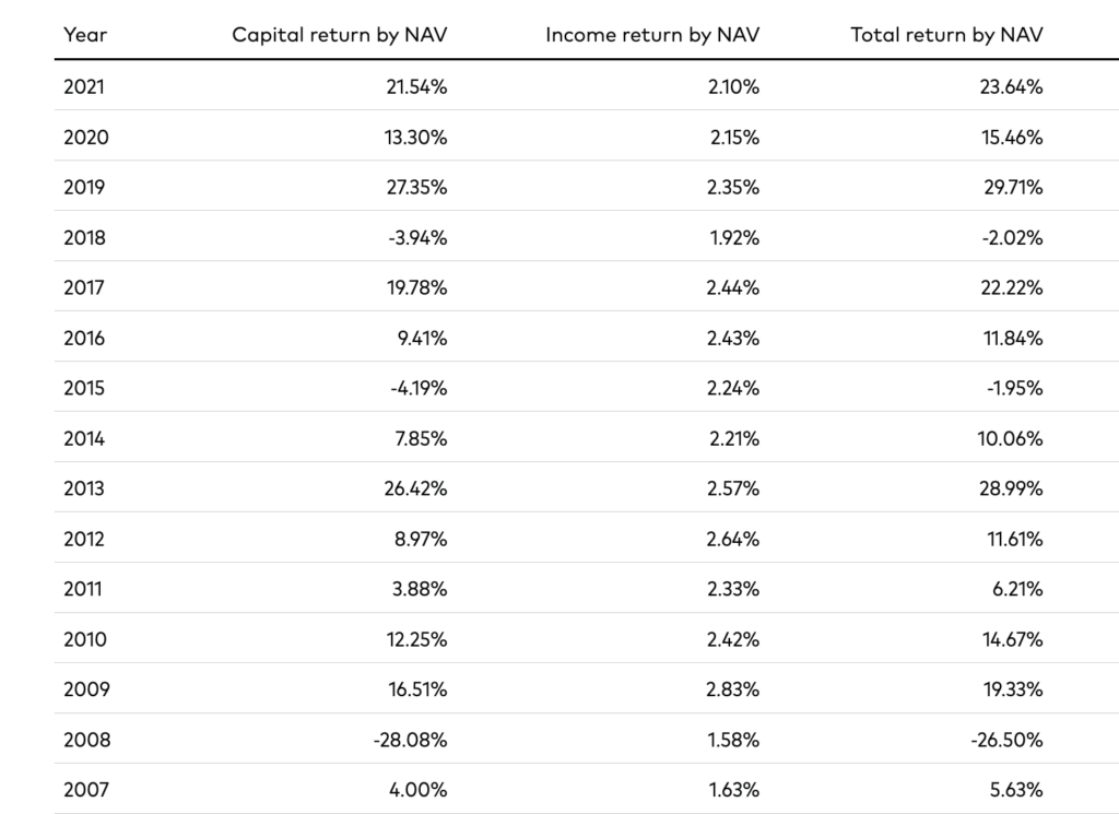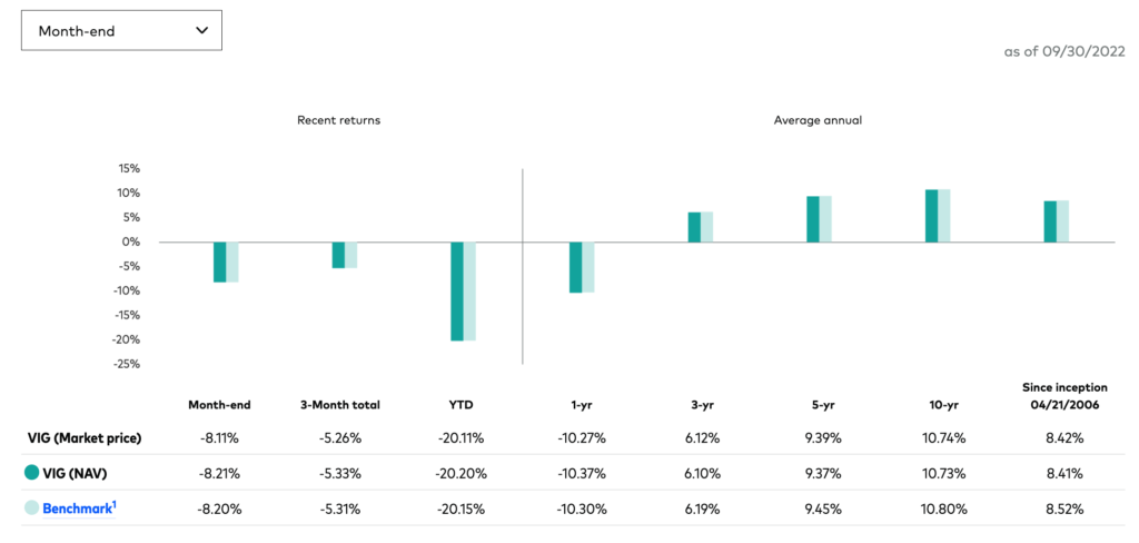 - VIGは設定来リターンが+277.29%、年率平均リターンは+8.41%の米国ETF