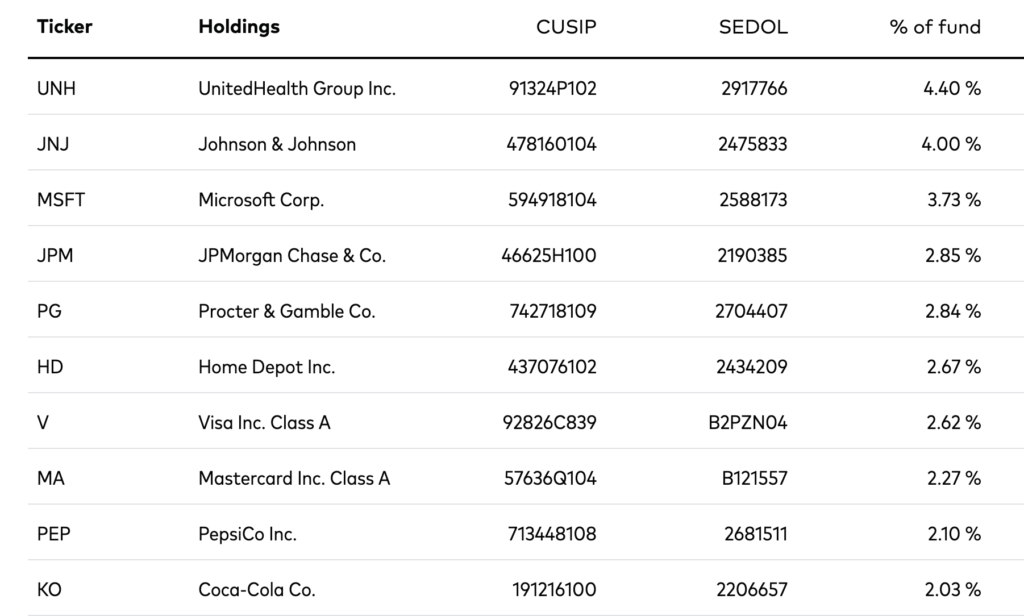 VIGの構成銘柄数は約250銘柄ですが、現在の上位10社は以下のとおりです。