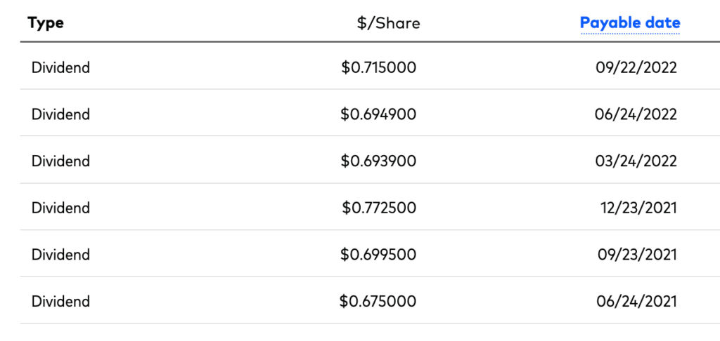 ちなみにVIGの分配金は3か月ごとに支払われますが、直近6回の実績は以下のとおりです。