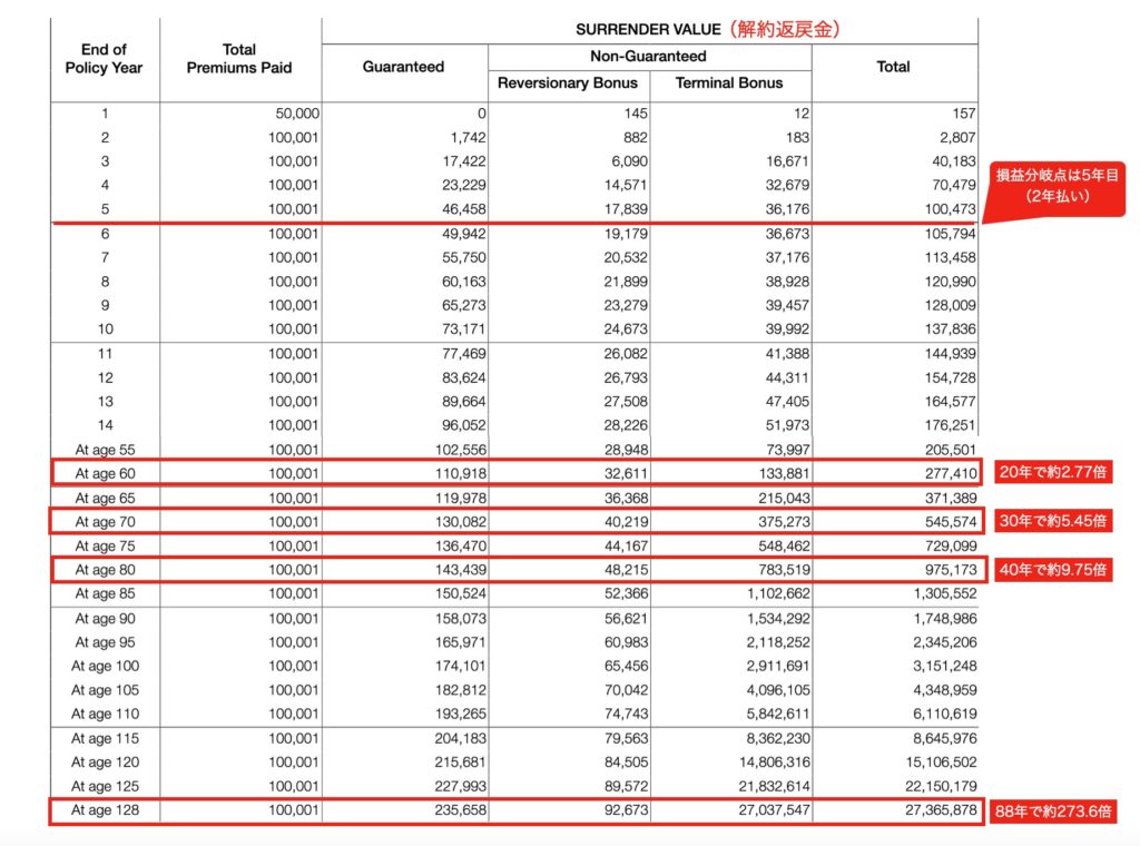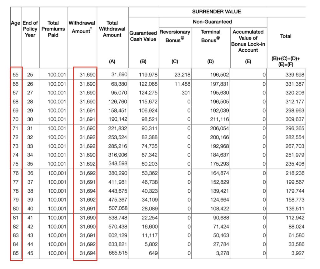 65歳から毎年USD31,690を受取りながら、それこそどこかのタイミングで解約返戻金を受け取って、老人ホームや介護施設に入居しても良いです。