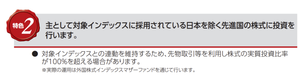 インデックスなので指数連動です。MSCIコクサイ・インデックスが対象インデックスになります。先進国株式とは言いますが、70%以上米国株なので米国株+その他先進国のイメージですね。