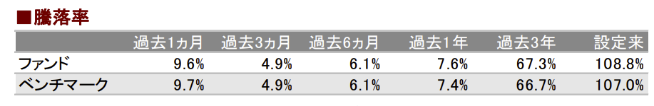 直近1年で+7.6%、3年で+67.3%のプラスになります。ベンチマークは先ほども触れたMSCIコクサイ・インデックスになります。