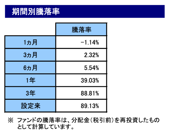 直近のリターンは日本株市場の下落もあり思わしくないですが、2017年12月の設定来のリターンは89.13%、この1年では39.03%のリターンとまずまず。