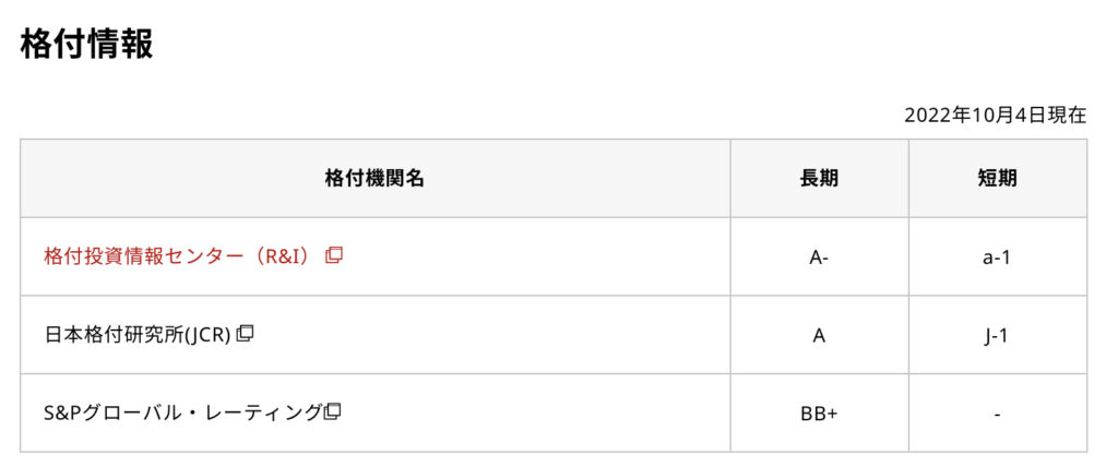 なお日本の格付け会社だとA格(投資適格)なのに、海外(米国)の格付け会社S&PだとBB+のジャンク債というのが実に非客観的だなと感じますよね。日本の格付け機関は日本企業を緩く格付けするんでしょうか。