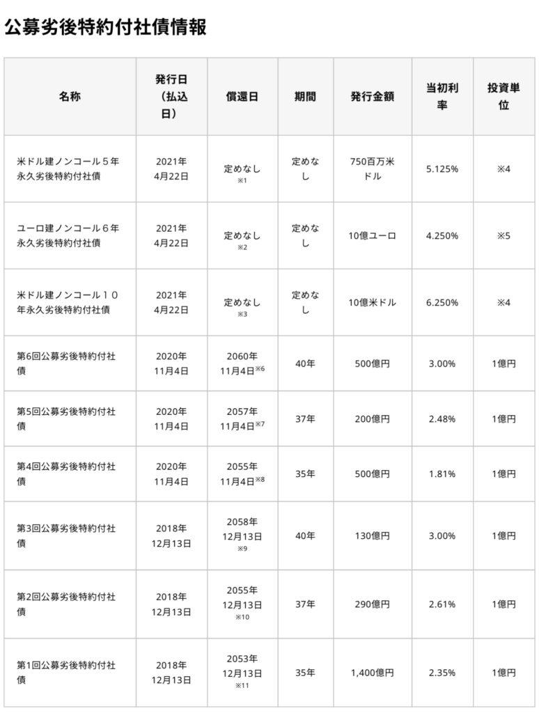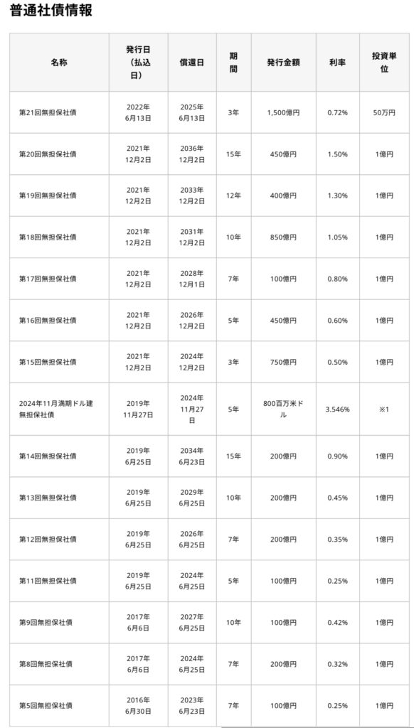実はこれまで既に何度も債券を発行しています。こちら楽天グループのIRサイトに出ている一覧です。