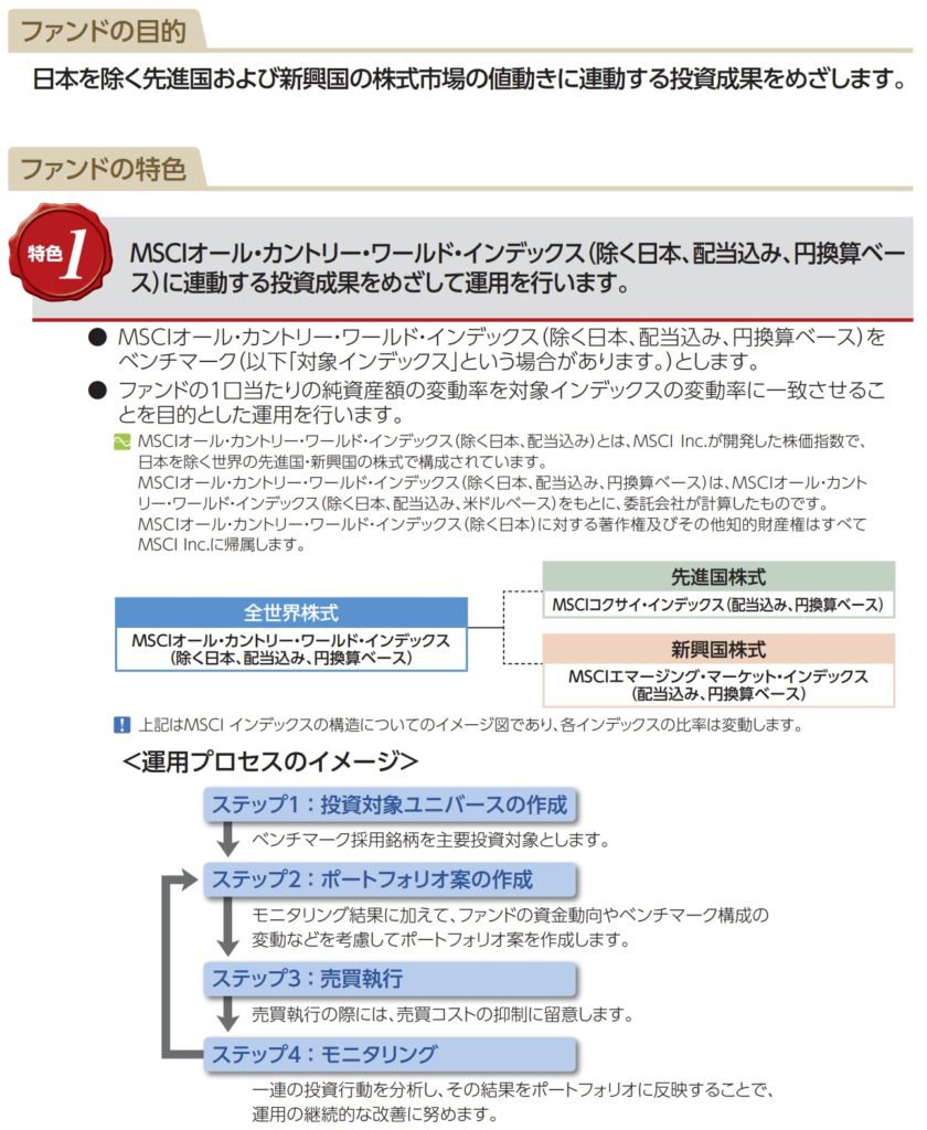 インデックスなので指数連動です。MSCIオール・カントリー・ワールド・インデックス(除く日本、配当込み、円換算ベース)が対象インデックスになります。日本以外の世界株にまんべんなく投資されています。