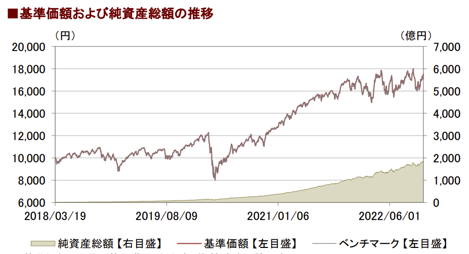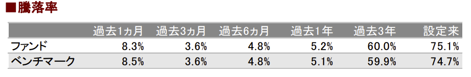 直近1年で+5.2%、3年で+60.0%のプラスになります。ベンチマークは先ほども触れたはMSCIオール・カントリー・ワールド・インデックス(除く日本、配当込み、円換算ベース)になります。