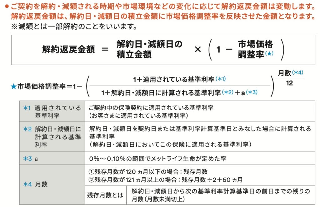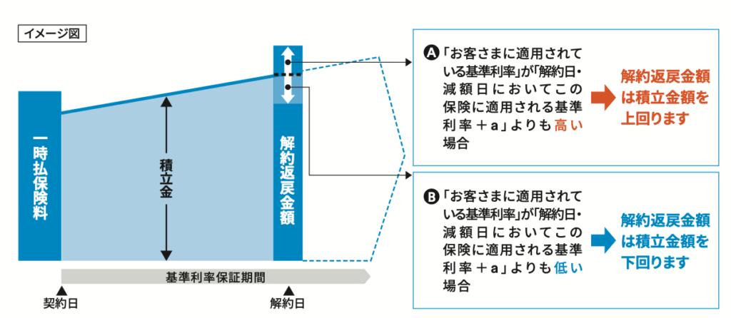計算式にするとチンプンカンプンになると思うので上図は見なくていいです。シンプルに契約時の積立利率と解約時の積立利率を比較して、低くなっていれば解約返戻金が増え、高くなっていれば減る。ということです(下図参照)。