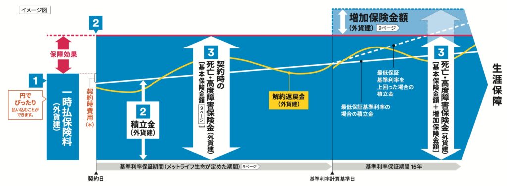 一時払の外貨建(米ドル、豪ドル)終身保険です。契約したときから一時払保険料よりも多い死亡保障の上乗せがあります。契約時の基準利率に応じて死亡保障の倍率と解約返戻金の増え方が決まります。契約時の基準利率は標準期間(5年、10年、15年、20年、25年、30年)の中からメットライフが決めます。標準期間が終わると基準利率は15年毎に更改されます。
