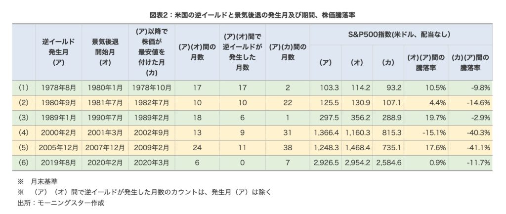 (カ)の項目は逆イールド発生月(ア)以降で株価が最安値を付けた月ですが、ITバブル崩壊(4)やリーマンショック(5)の際はずるずる株価は下がっていきましたから、逆イールドが発生してから最安値を付けるまでに2〜3年を要しておりますが、どの期間においても株価は下がっているということです。