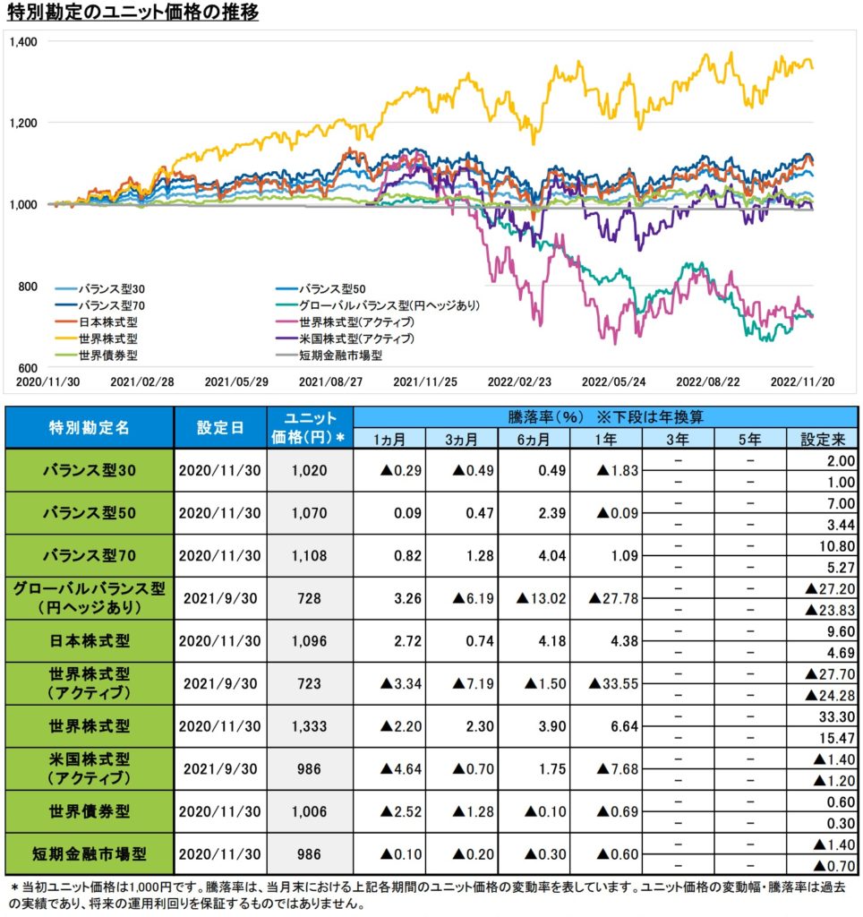 運用年数はそれぞれ違いますが、ユニット価格というのが元々の基準値1,000からどれだけ増えたか、減ったかという数字になります。次に一番右側の設定来の騰落率を見てください。「バランス型30」の場合、運用開始当初に投資した金額が2%増えており、年換算だと1%/年ということです。