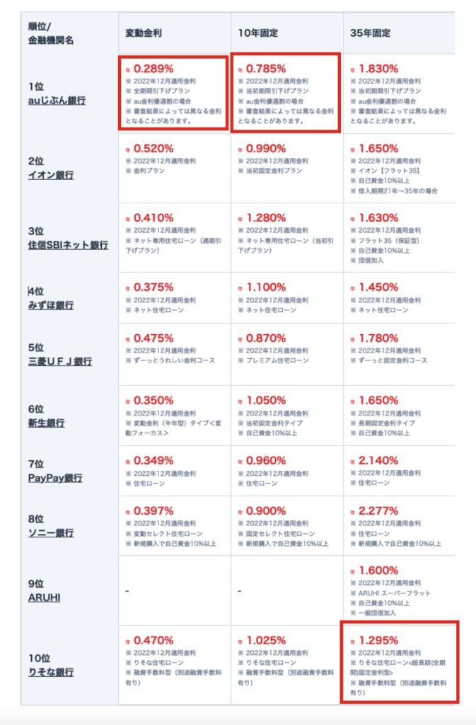 以下は、エイチームライフデザインが住宅ローンのおすすめ比較として纏めていた「変動金利・固定金利ランキング(2022年12月)」ですが、変動金利と35年固定で金利が一番低いものを比較しても、1%程度の差があります。