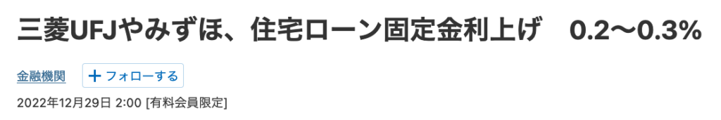 三菱UFJ銀行やみずほ銀行が、2023年1月の住宅ローン金利について、10年固定で前月比0.2〜0.3%程度の引き上げを検討しているようですね。