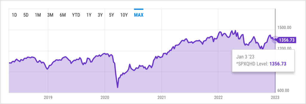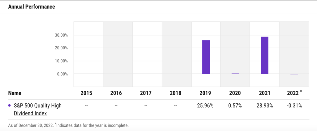 S&P500指数の2022年のリターンが−19.97%でしたから、S&P 500 Quality High Dividend Indexの−0.31%リターンというのはたいしたものですね。