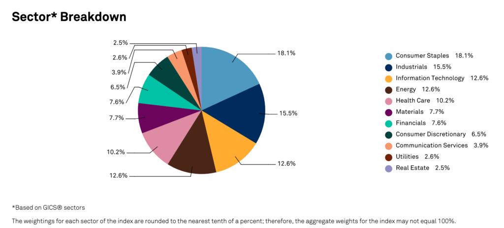 また、セクターで見ても、IT26.4%、ヘルスケア15.2%、金融11.6%というS&P500指数に対して、金融26%、資本財13.3%、生活必需品13%と大きく異なるようです。