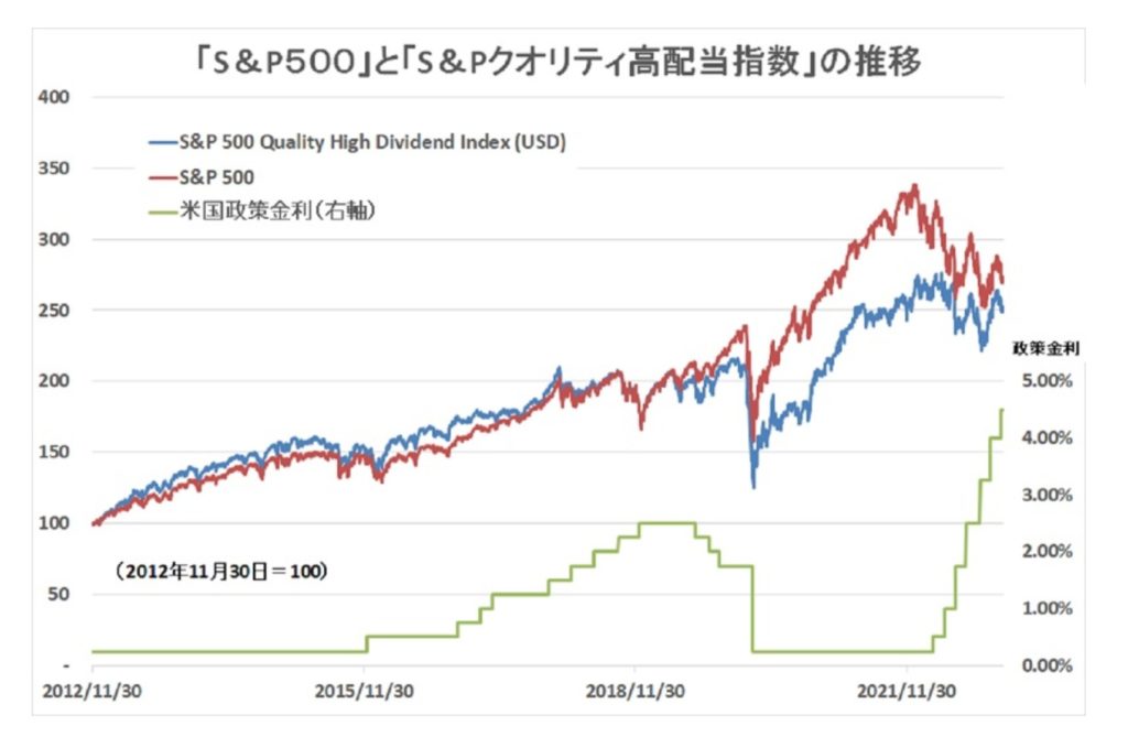 昨年から続くの金融引き締め局面においては「S&P 500 Quality High Dividend Indexの」の方がパフォーマンスは良いですね。また、S&P500指数に比べて下落幅も抑えられております。
