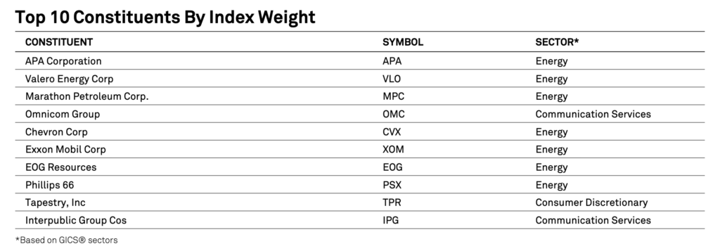 ただ、連動を目指すS&P 500® QUALITY HIGH DIVIDEND INDEXS&P500クオリティ高配当指数)の最新のFactsheet(DECEMBER 30, 2022)で確認したところ、組入上位10位銘柄はエネルギー関連銘柄が多くなっており、