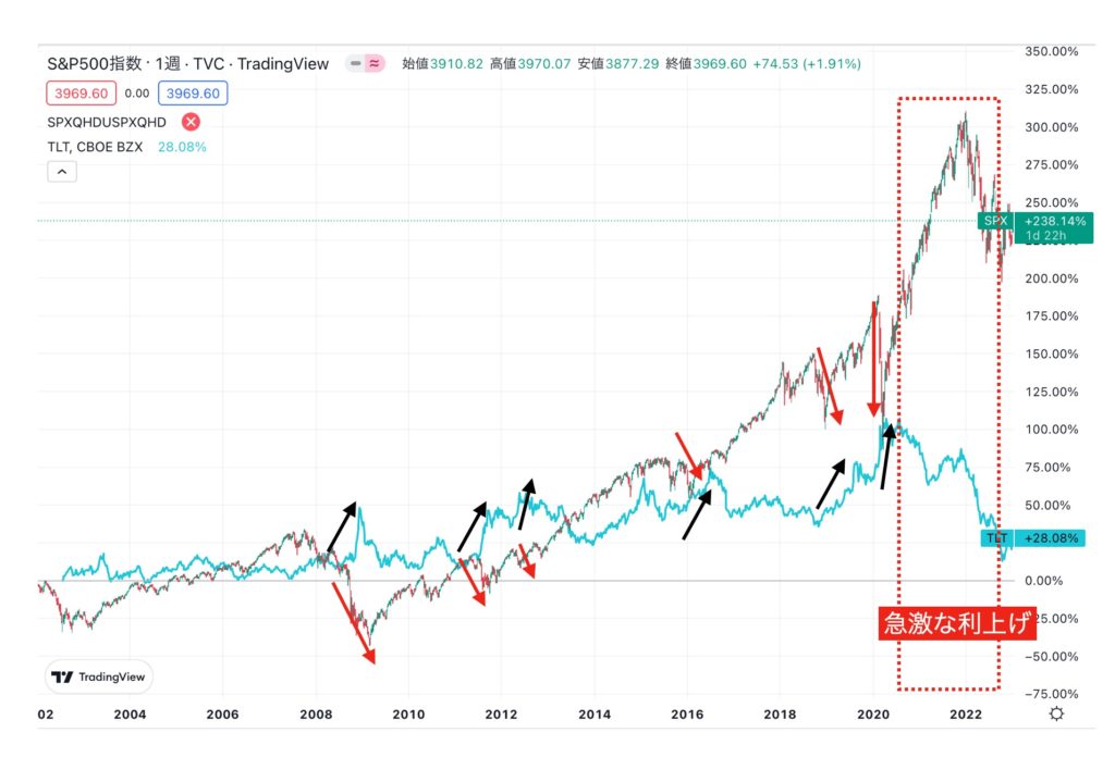 - S&P500指数が下落したタイミングでTLTは上昇している