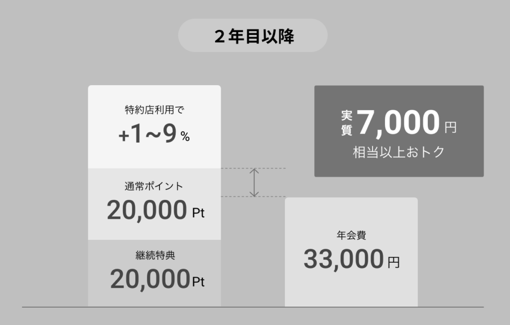 2年目以降の利用金額で見てみると、毎年200万円以上の利用(特約店利用の付加ポイントは考慮せず)があれば、7,000円相当以上のお得になるようです。