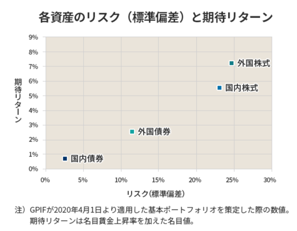 下のグラフはGPIF(年金積立金管理運用独立行政法人)が2020年4月1日より適用した基本ポートフォリオを策定した際に使った「期待リターン(予想される収益率)」と「リスク(標準偏差)」の関係を、主な資産ごとに比較したものです。
