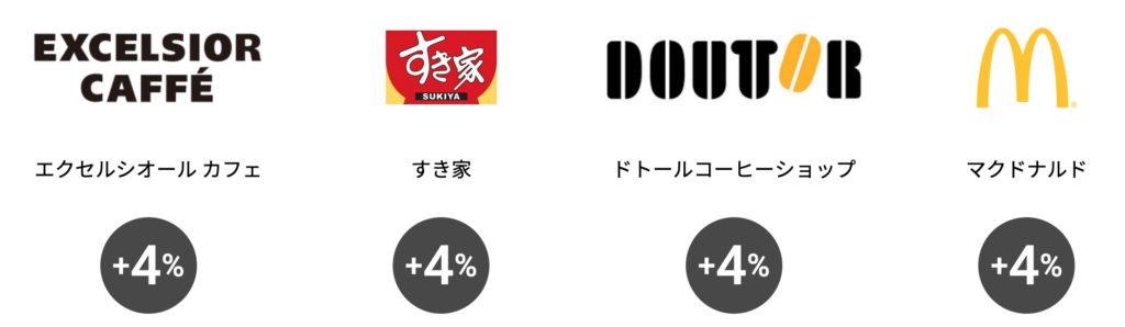 さすがに+9%を付与する会社は限定的でしたが、一般の方がよく利用するようなお店は+4%付与するところも多いですから、これらのお店をよく利用する方は保有する価値はあるかも知れませんね。