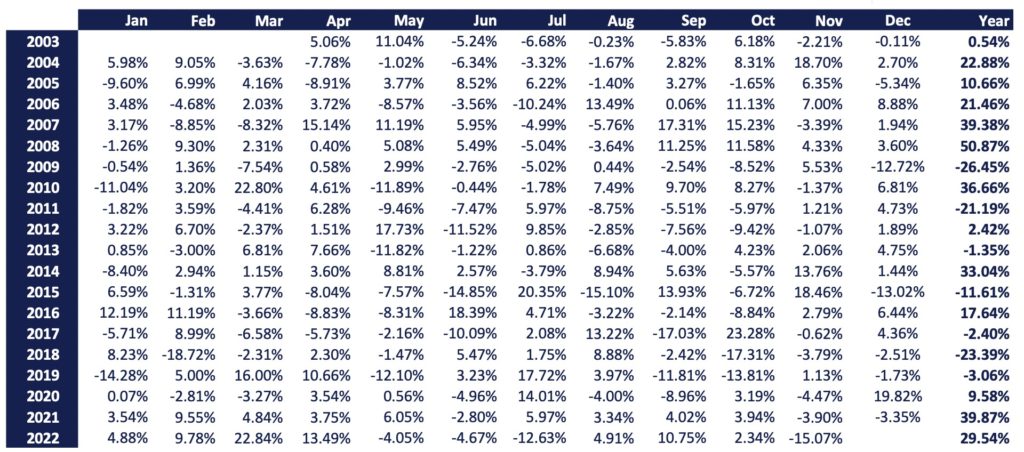 市場が落ち込んでいる直近の2年をみても、非常に高いリターンを出していることが分かります。長期的にみると年平均のリターンは9%以上ですが、プラスを出す時は、ほとんどが10%以上のリターンを出していますし、そのうちのほとんどで20%以上のリターンが出ています。