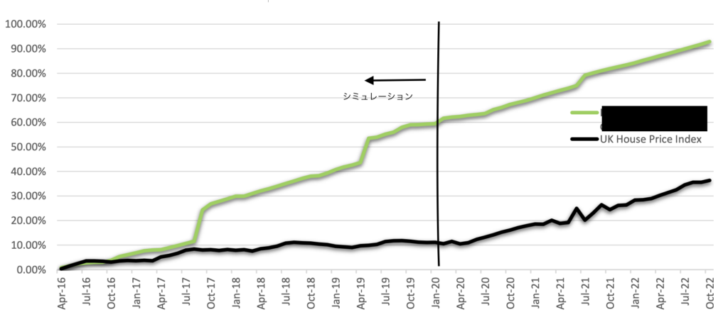 シミュレーションとはいえ、右肩上がりで6年半で90%以上のパフォーマンスが算出されています。直近のコロナ感染や、ウクライナ侵攻・金利利上げも関係なしですね。