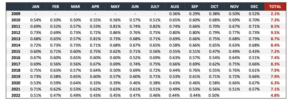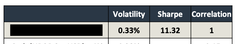 年平均リスクが1%を切っています。しかもマーケットの影響を受けずに、着実にリターンを出しているので、安心できるファンドです。