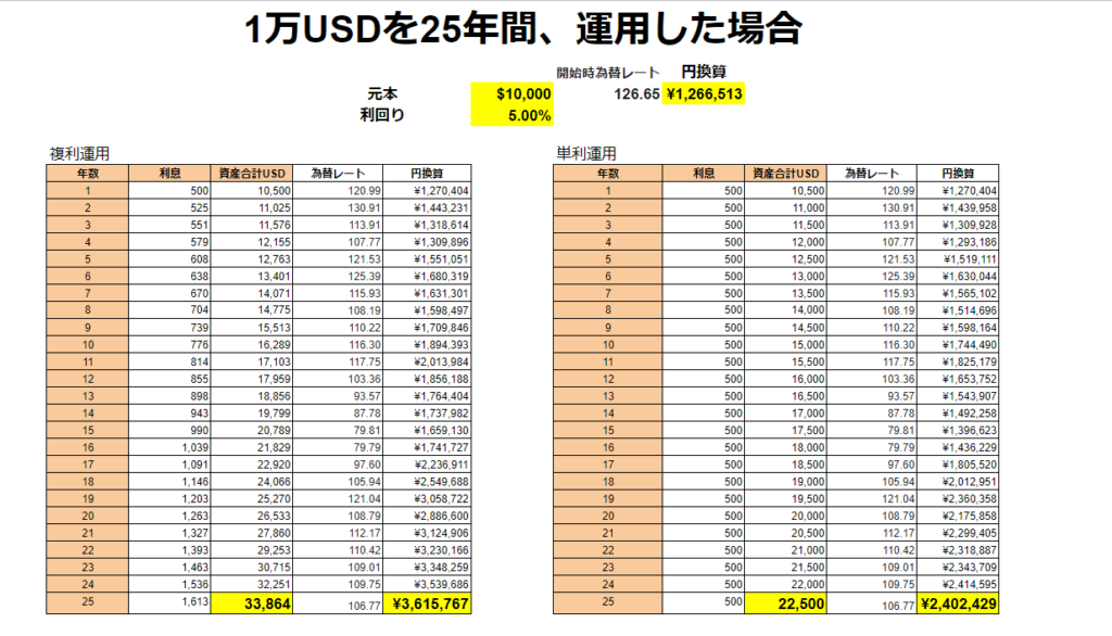 今回、日本円ではなくUSDで検証してみました。オフショア投資を実感できるように、円安が将来円高になり、ドルから円に交換すると為替損が発生するという想定で実施しています。為替レートは実際のデータから抽出していますので、シミュレーションとはいえ、かなりリアルに近いです。その比較がこちら。1ドルが126.65円の時に10,000ドル投資、これを25年間単利と複利で比較となります。
