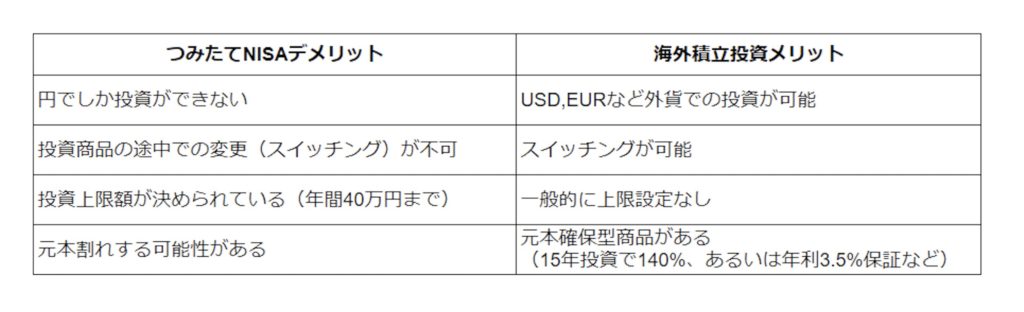 なぜ、海外の積立投資をわざわざするの?そう思う人もいると思いますので、大まかなつみたてNISAのデメリットと海外積立投資のメリットを対比してみましょう。