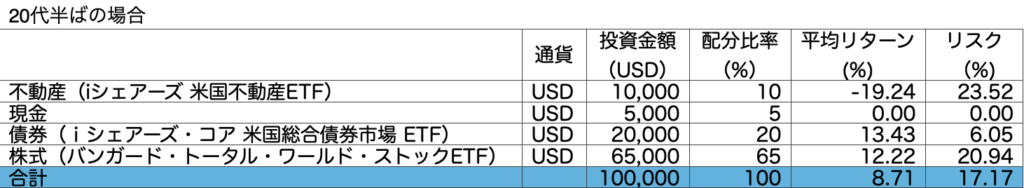 20代半ばの場合、ポートフォリオ全体での年平均リスクは17.17%、リターンは8.71%、