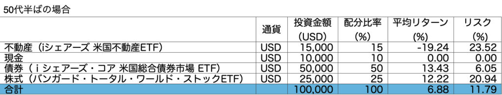 50代半ばの場合は年平均リスクが11.79%、リターンは6.88%です。