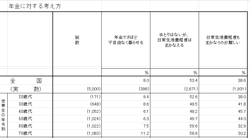60代以降の世代で年金で十分と考えているのは1割にも達していません。日常生活程度が限度というのがその答えなのです。