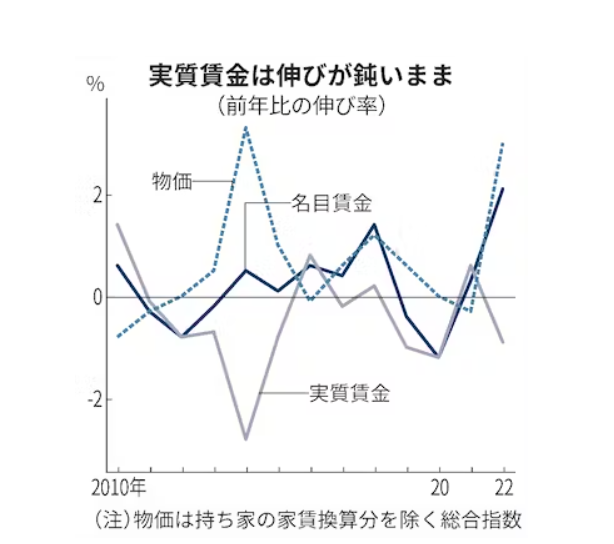日経新聞で『22年の実質賃金0.9%減、給与2.1%増、物価高下回る』という記事がありました。給与が増えてもインフレ率が上回っていたので、生活面でのメリットが感じられなかったのです。これだと私達が消費に回すお金がさらに小さくなり悪循環になってしまいます。