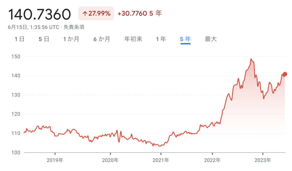 過去5年間のUSDと円の為替を示したグラフです。最安値時を考えると約30%の下落です。つまり5年程度で日本人は約30%分損している形になります。