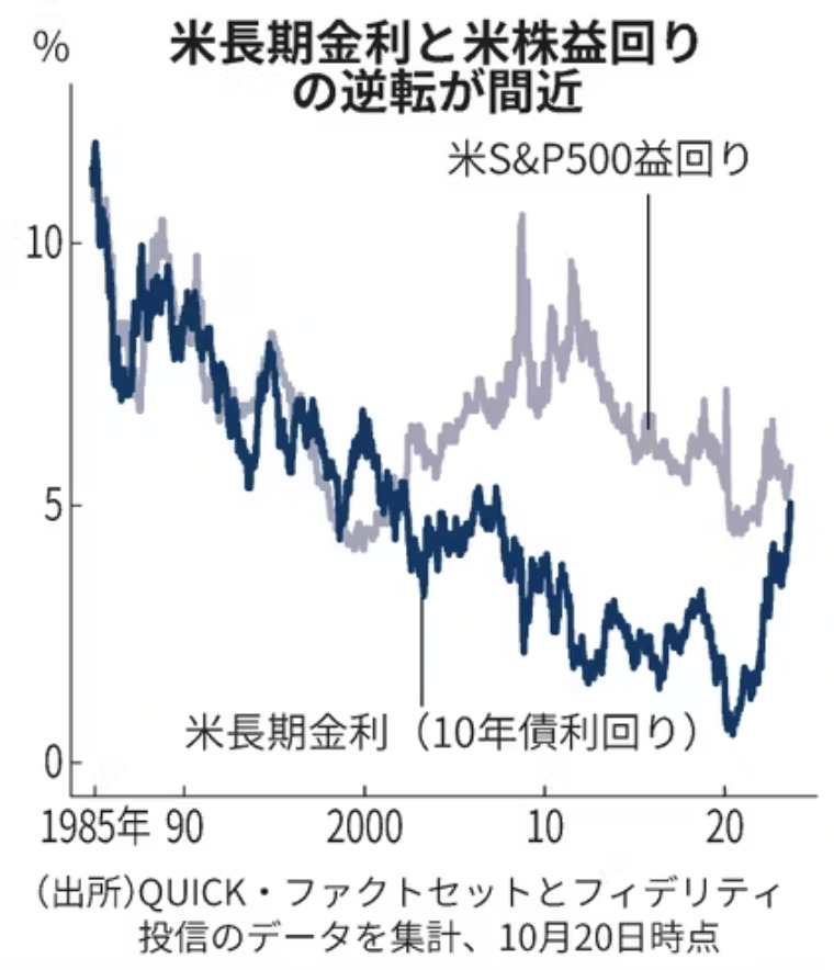 一般的には、リスクゼロの米国債利回りはリスクの高い株式市場の益利回りよりも低いのですが、ここまで債券利回りと益利回りのスプレッドが縮小してくると、割高な株を売って債券を買うというのも一つですね。