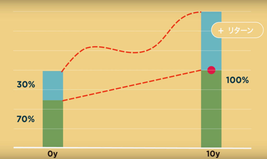 ファンドの運用開始をする際に投資額の70%は安全資産である米国債券へ投資をします。米国債券は金利と満期がありますので、その満期まではその金利が固定でもらえますので、確実な収益と元本が確保できます。そのため70%の部分を投資をした資産は満期時(例えば10年後)には100%となって返ってきます。これが「元本確保」のスキームです。