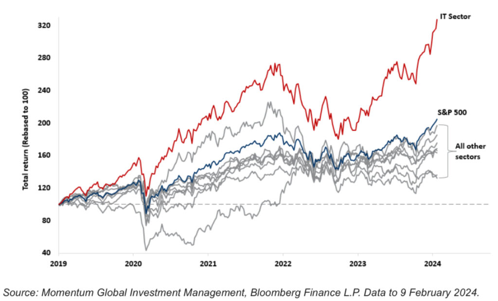 2019-2024年の5年間のITセクターだけとS&P500を比べても、倍近くの差があるので、改めてハイテク株、特にMaginificent7へ投資をしていた方が良かったということがわかります。