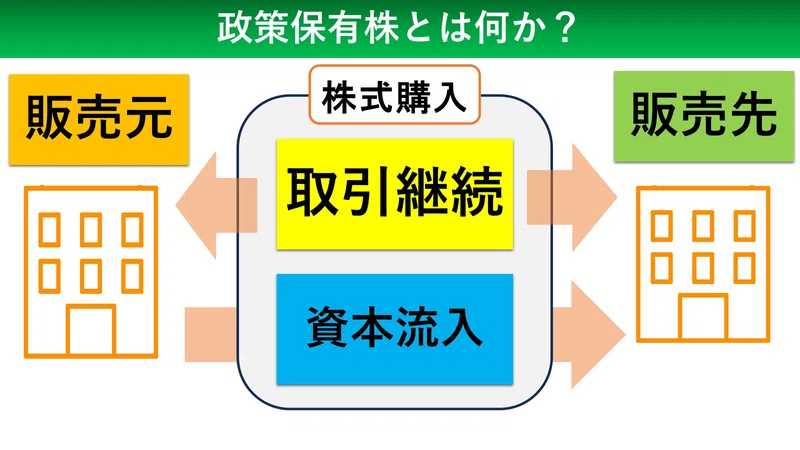 政策株とは、企業が取引先や関連企業の株式を保有し、企業間の関係を強化するための株式保有を指します。これには、以下のような具体的な目的が含まれます: