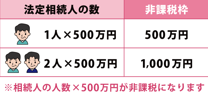 法定相続人が配偶者のみの場合、非課税枠は500万円となります。例えば、死亡保険金が1000万円の場合、500万円が非課税となり、残りの500万円に対して相続税が課されます。