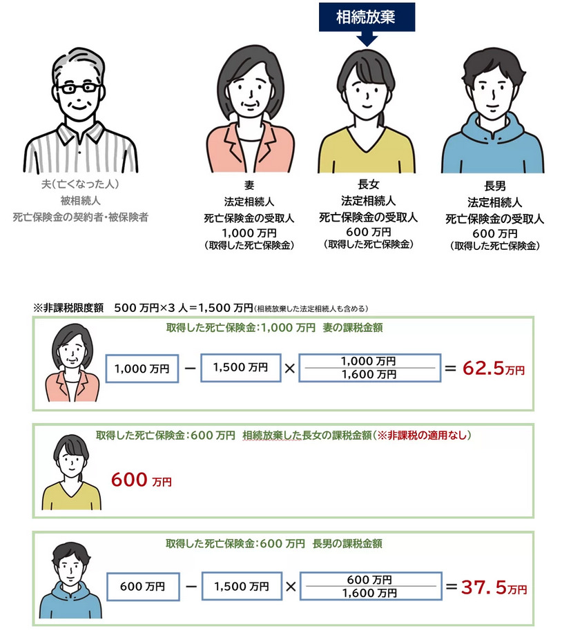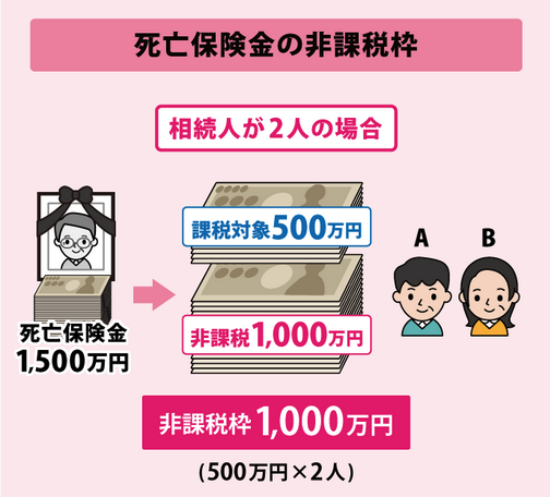 法定相続人が配偶者と子供2人の計3人の場合、非課税枠は1500万円となります。例えば、死亡保険金が2000万円の場合、1500万円が非課税となり、残りの500万円に対して相続税が課されます。