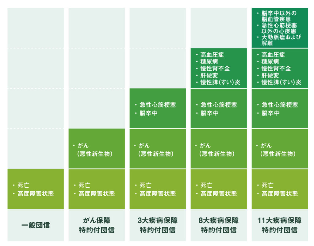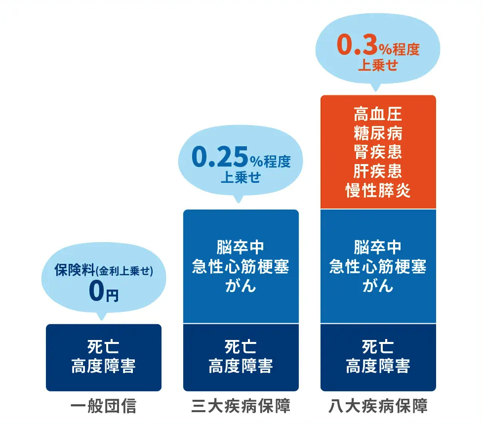 • 基本保障: 一般的な団体信用生命保険で、死亡または高度障害時にローン残高が補填されます。ローン契約者がこの状態になった場合、保険会社が残りのローンを一括で返済します。