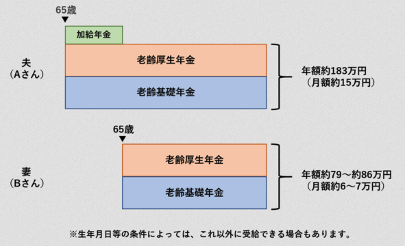 - 現行の年金制度に基づき、国民年金部分(基礎年金)と厚生年金部分を合算した年金額