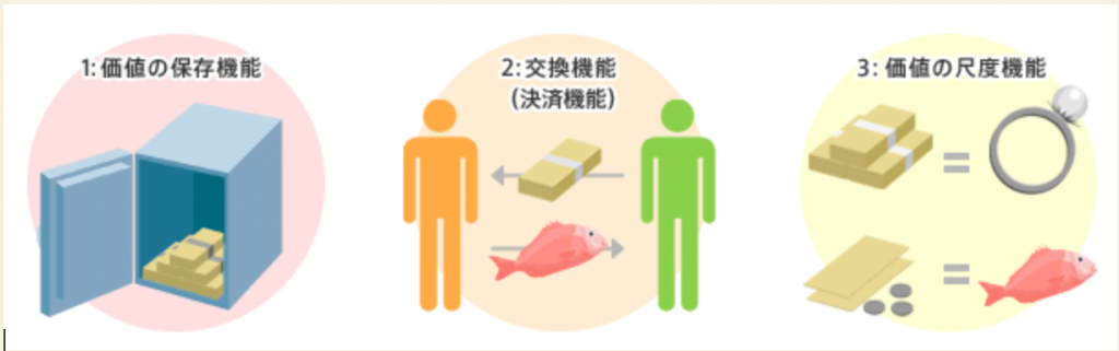 一般的に、お金には以下3つの役割(機能)があると言われています。