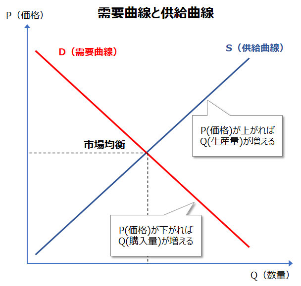 • 供給:生産者がある価格で提供したいと考える財やサービスの量を意味します。供給は価格が上がると増加し、価格が下がると減少する「供給の法則」に従います。