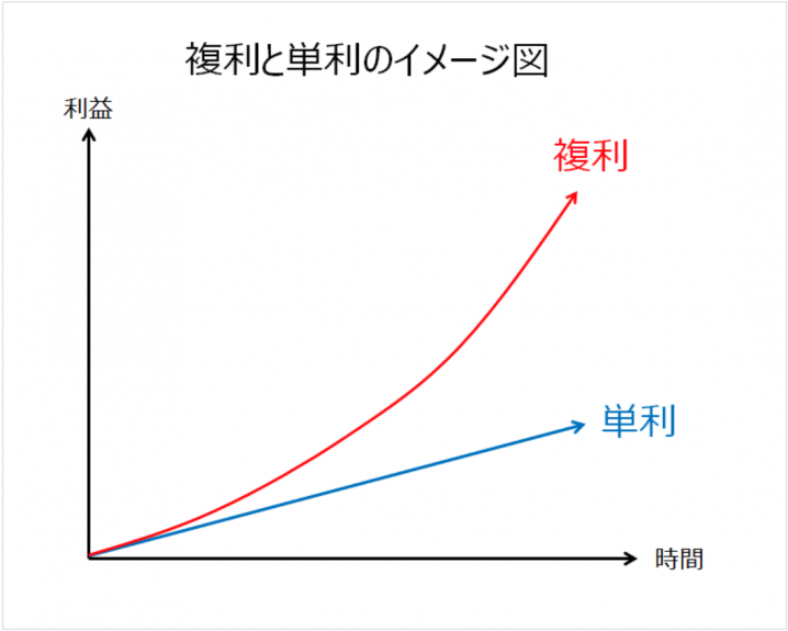 - 「複利」は利益が利益を生み、指数関数的に増えていく