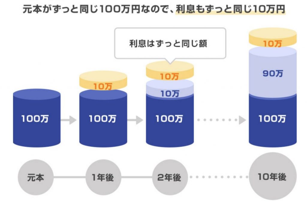 複利に対し、当初の元本に対してのみ、利息が計算される方法を「単利」といいます。