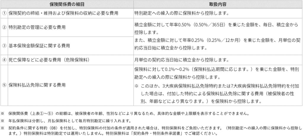 保険関係費とは、お払込みいただいた保険料または積立金から控除される諸費用です。保険関係費の細目は下表のとおりです。